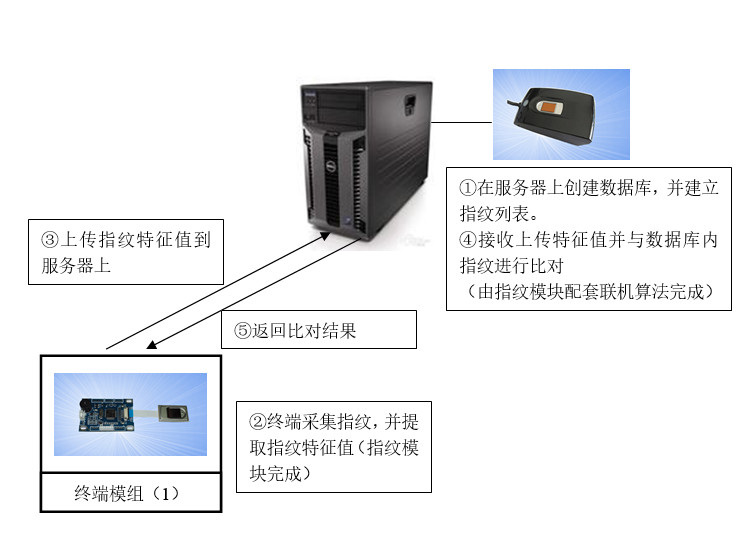 說明:本方案要求在終端采集指紋,處理成特征值數(shù)據(jù),上傳到服務(wù)器中,與數(shù)據(jù)庫中的所有指紋進(jìn)行比對(duì),并返回比對(duì)結(jié)果給終端機(jī)。