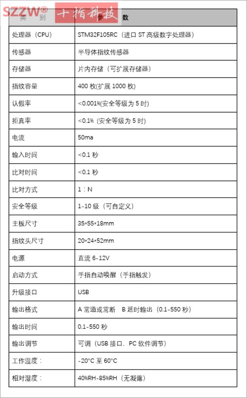 ? ?按指紋,檢測到手指后啟動模塊,并采集指紋、驗證成功后,輸出閉合信號0.1-550秒(繼電器,不帶電),自動斷開。